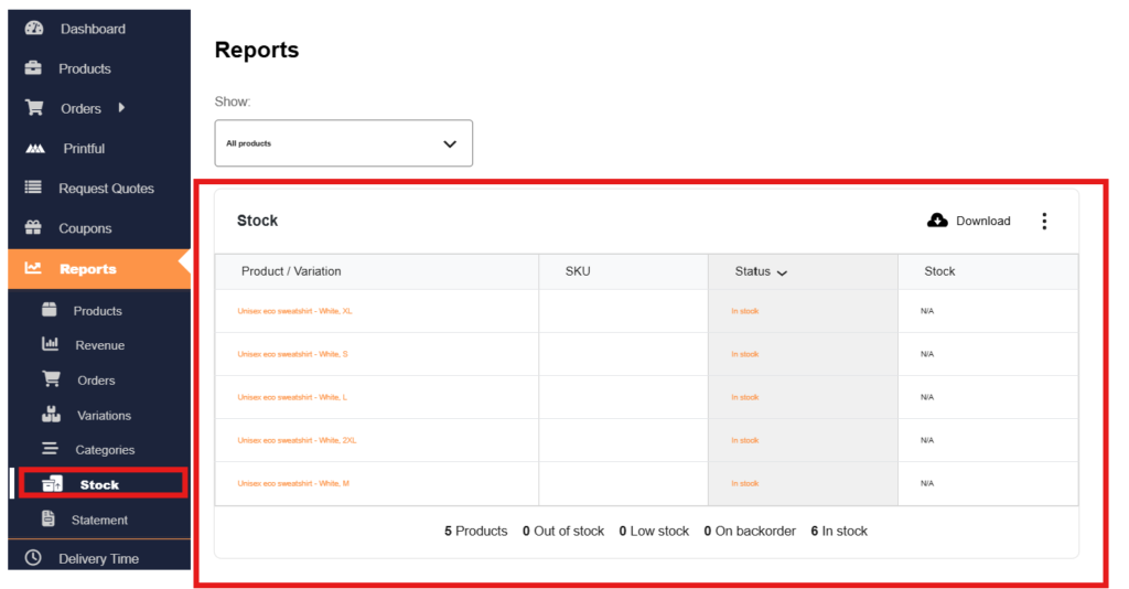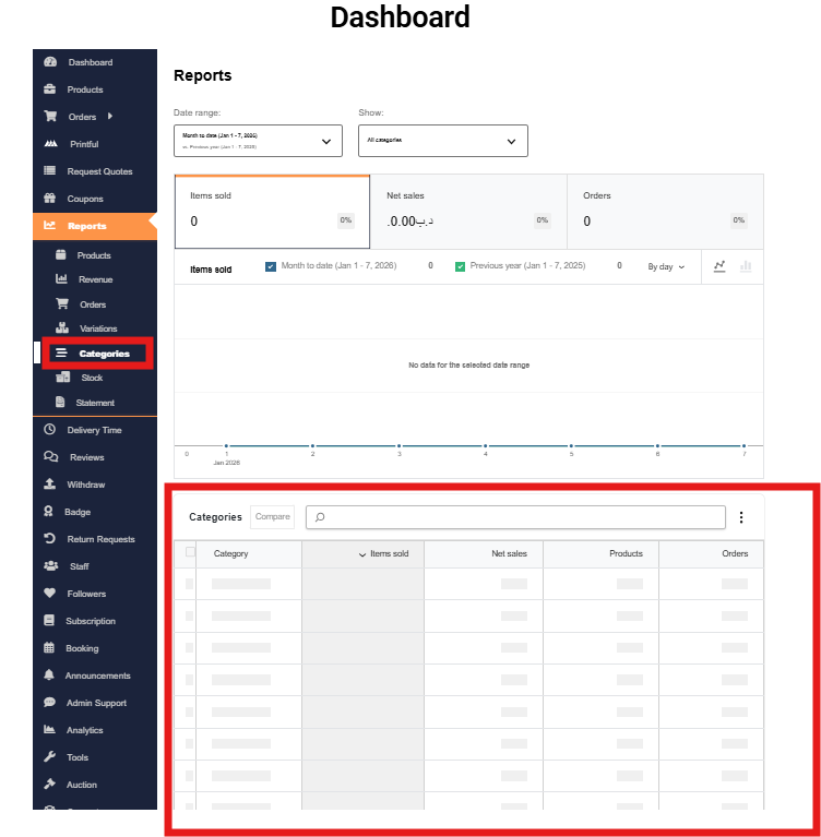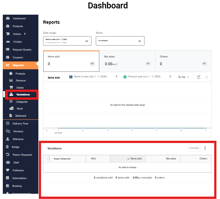 Using the Reports section, you can see detailed information about your products, such as how many items you have sold, which products or variations perform best, and how different categories contribute to your sales. This allows you to focus on popular products, improve low-performing ones, and plan future listings more effectively.