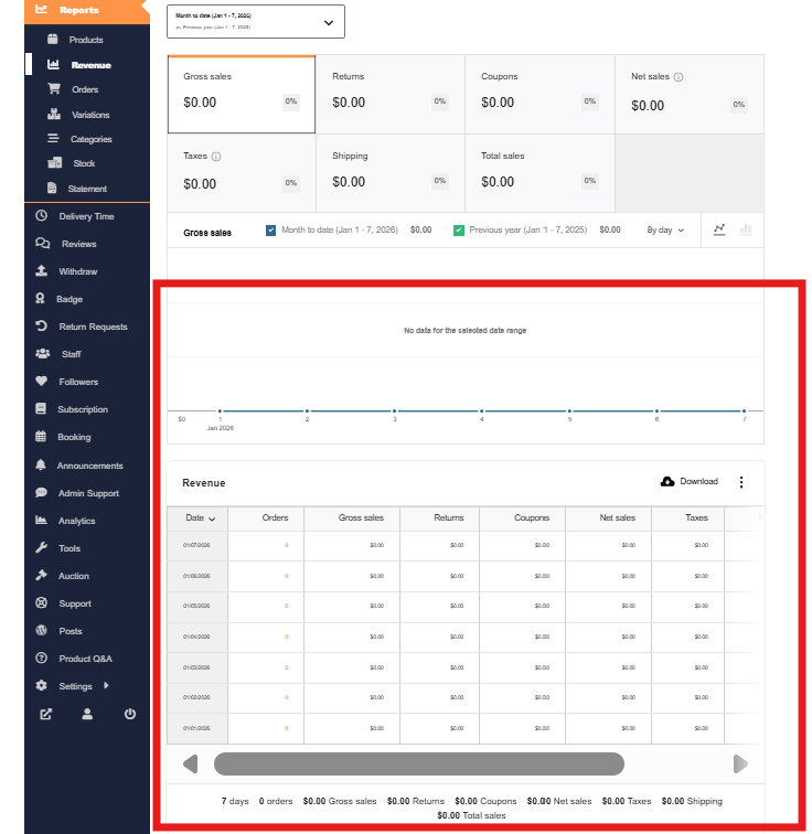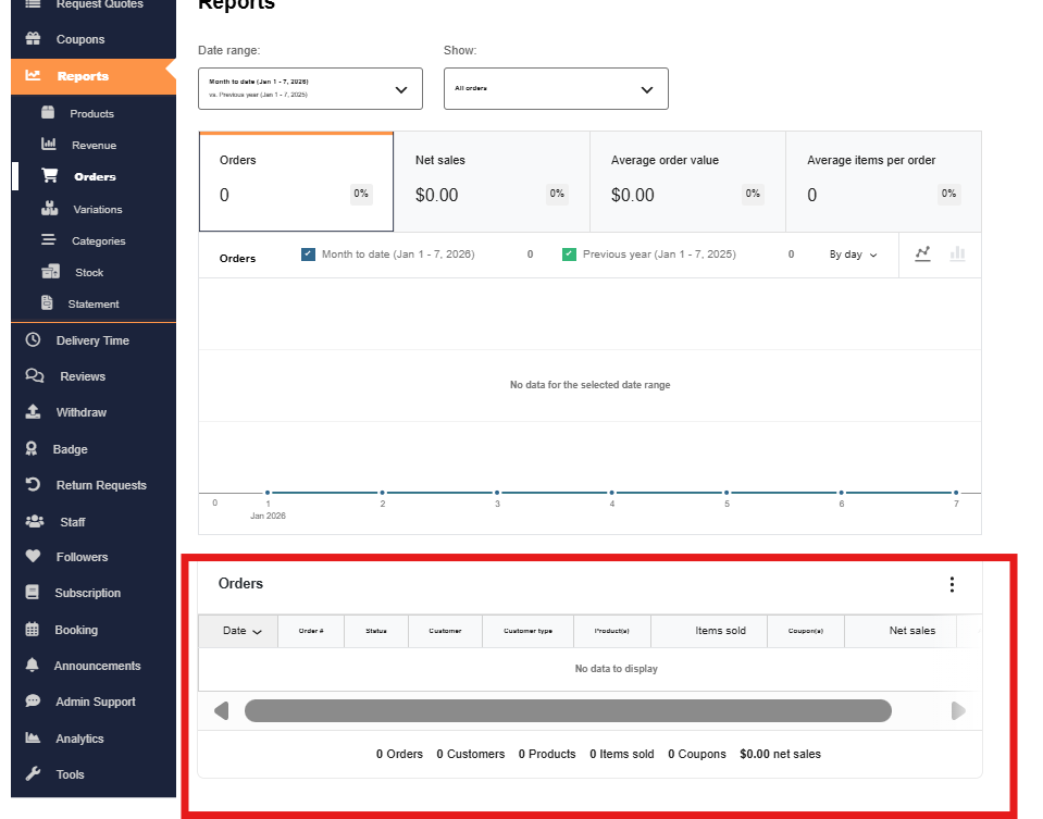If you see “No data for the selected date range”, it simply means there are no sales yet — this is normal for new stores.
